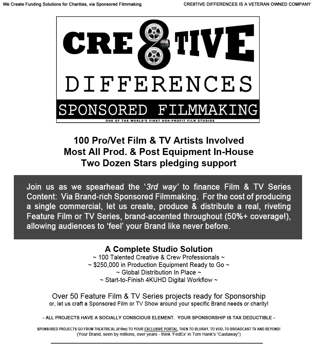 We have an amazing collection of Talent, and several award caliber Shorts written and ready for production across several genres, all with socially conscious plots and/or characters regarding a number of charitable subjects, such as Anti-Bullying, Autism & Gang Violence. Please keep in mind, these are not 'fluff' pieces, docu-dramas or "PR outings", but scripted, hard-hitting & socially challenging theatrical films; many times 'R' rated in content, and we stay true to genre. The Short we create through your Sponsorship (like all C8D content), will have star power, is professionally produced and can go on to win all kinds of awards, even Oscars and Golden Globes...and we want to take your Brand with us.